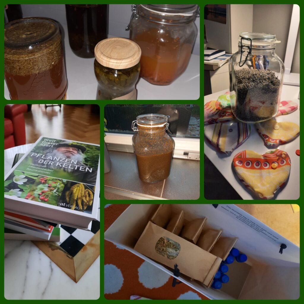 Auf meinem Tisch liegen mindestens sieben Bücher, die noch gelesen werden möchten. / Ein Online-Seminar bei der Storl-Akademie ist noch nicht beendet. / Ein Päckchen für meine liebe Kollegin in München wartet noch auf Vervollständigung: das Johanniskrautöl ist schon lange abgefüllt, auch das Kraut ist getrocknet und in Papiertütchen als Tee abgefüllt. Aber die Lavendelkissen fehlen noch. / Ein paar Oxymele ziehen noch so vor sich hin, ebenso ein Sanddornöl, das dann aber schnell verarbeitet werden muss.